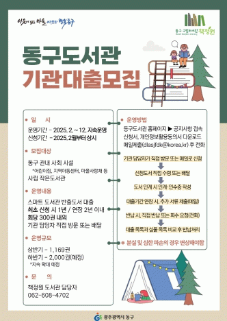 동구는 올해 하반기 6~7개소 기관을 대상으로 2천여 권을 대출할 계획이다. 대출은 원하는 기관은 동구 도서관 누리집에서 관련 서류를 내려받아 작성 후 담당자 이메일로 보내면 된다.