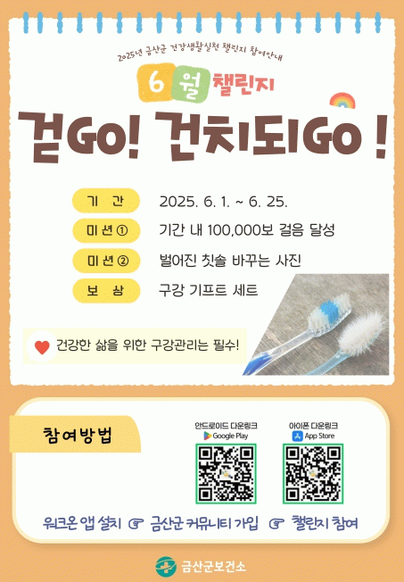이번 챌린지는 구강보건을 주제로 벌어진 칫솔을 바꾸고 건강을 위해 걷자는 의미를 담았으며 기간 동안 10만 보 걸음을 달성하고 벌어진 칫솔 바꾸는 사진을 1회 인증하면 된다.