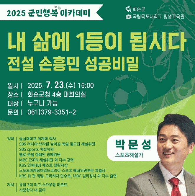이번 강연에서는 손흥민 선수가 세계 정상급 선수가 되기까지의 도전과 성장 과정을 중심으로 ‘나만의 1등’을 향한 노력과 의지, 그리고 삶의 방향을 되돌아보는 시간을 군민들과 함께 나눌 예정이다.
