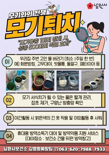 남원시보건소장은 “말라리아 위험지역에 여행, 군 복무 후 의심 증상 발생 시 신속히 가까운 의료기관에서 진료를 받아야 하며 모기 물림 예방 수칙을 준수해달라”고 당부했다.