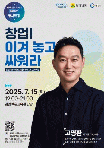 그는 “창업, 이겨놓고 싸워라”(부제 : 창의적인 아이디어는 어디서 오는가?)를 주제로, 반복된 실패를 이겨내고 자신만의 방식으로 사업에 성공한 여정을 유쾌하고 진솔하게 풀어낼 예정이다.