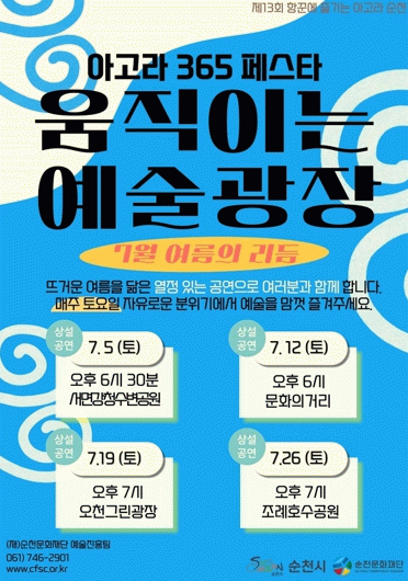 순천문화재단 관계자는 “지붕없는 예술공간에서 시민 모두가 삶의 활력과 즐거움을 느낄 수 있도록 시원한 바람으로 찾아가는 7월 아고라 순천 공연에 많은 관심과 참여를 부탁드린다”고 말했다.