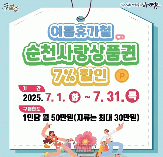 시 관계자는 “이번 특별할인이 여름휴가철 순천을 찾는 관광객과 시민들의 알뜰한 소비생활에 도움이 되고, 지역경제 활성화에도 기여하길 기대한다”고 전했다.