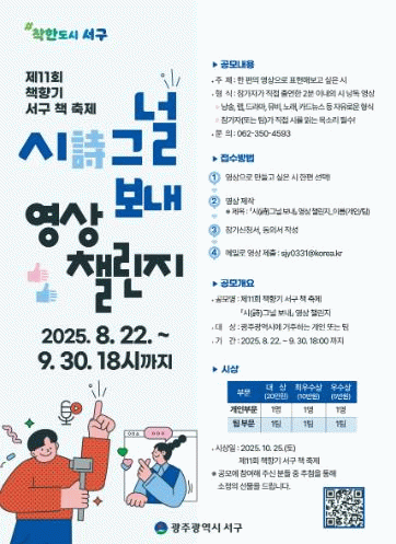 서구는 9월 한달간 ‘시(詩)그널 보내’ 영상 챌린지를 비롯해 ‘독서의 달’ 프로그램과 북콘서트 등을 운영한다고 밝혔다.