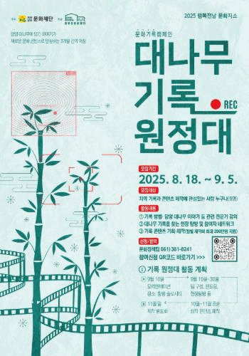 재단 관계자는 “이번 프로젝트는 지역 대표 자원인 담양 대나무를 중심으로 담양의 가치를 기록하는 실험적 문화 프로젝트”라며, “담양 고유의 문화 콘텐츠 제작에 관심 있는 분들의 많은 지원을 부탁드린다”라고 말했다.