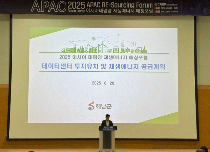 포럼에서는‘솔라시도 데이터센터 투자유치 및 재생에너지 공급계획’을 발표하며 산이면 일원 국내 최대 규모 5.4GW 태양광 재생에너지 집적화단지 조성계획과 RE100 기반 AI 데이터센터 및 산업단지 조성 비전을 세계 무대에 소개했다.