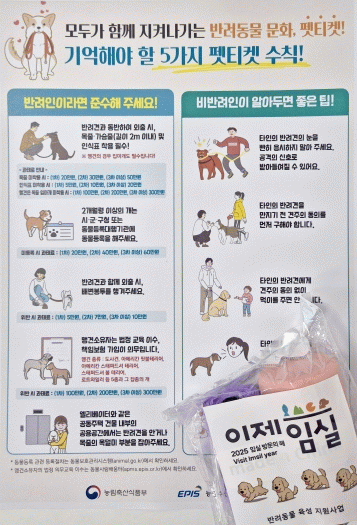 이번 홍보활동은 반려견을 기르는 가정이 늘어남에 따라 반려견과 함께하는 산책 시 지켜야 할 기본적인 펫티켓을 알리고, 성숙한 반려 문화 정착을 위해 마련됐다.