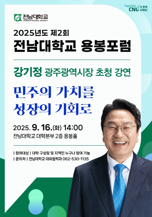 이번 강연에서는 광주의 역사와 민주 정신을 오늘의 성장 동력으로 삼아야 하는 이유, 그리고 대학과 지역이 함께 만들어갈 미래 비전을 풀어낼 예정이다.