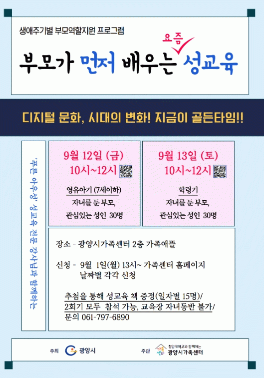 강의는 사단법인 ‘푸른 아우성’ 소속 성교육 전문 강사가 맡아, 부모들이 변화하는 성문화 속에서 올바른 성 가치관을 자녀에게 전할 수 있도록 돕는다.