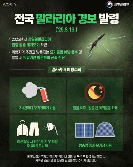앞서 질병관리청은 31주 차(7월 28~8월 3일) 강원 양구군에서 채집된 얼룩날개모기류에서 국내 첫 삼일열말라리아 원충 감염이 확인됐다고 밝혔다.