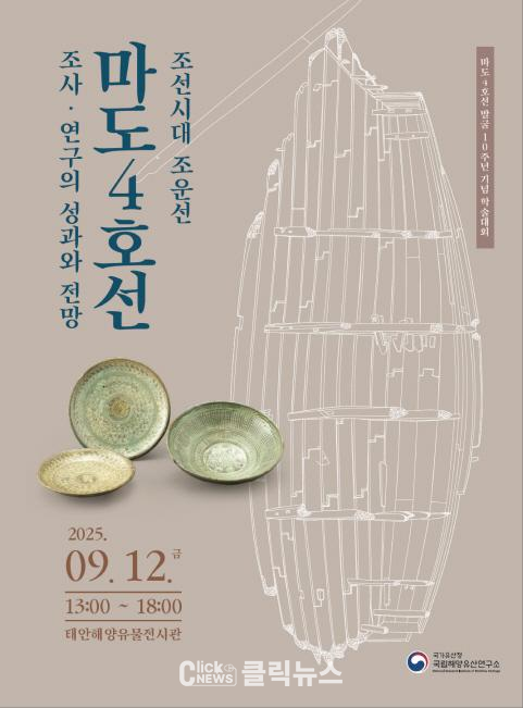 주제발표는 조선시대 조운제도의 역사적 변천(문광균, 충남역사문화연구원), 마도해역 출수 난파선 구조 분석과 조선기술 변화 고찰(홍순재, 국립해양유산연구소), 마도4호선 출수 분청사기의 의의(박경자, 국가유산청), 마도4호선 출수 석재유물 연구(홍광희, 국립해양유산연구소), 조선시대 해난사고 현황과 특징(김선, 국립해양유산연구소), 베트남의 수중고고학(응우옌 반 도안, 베트남국립역사박물관) 순으로 진행된다.