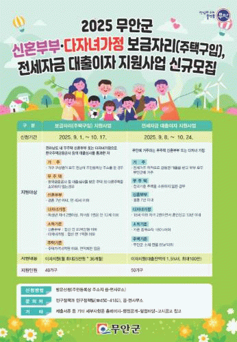 2024년 10월 1일부터 2025년 9월 30일 사이, 무안군 내 6억 원 이하 주택을 구입하고 한국주택금융공사의 보금자리론이나 디딤돌 대출 등 심사를 통과한 무주택 가구가 신청할 수 있다.