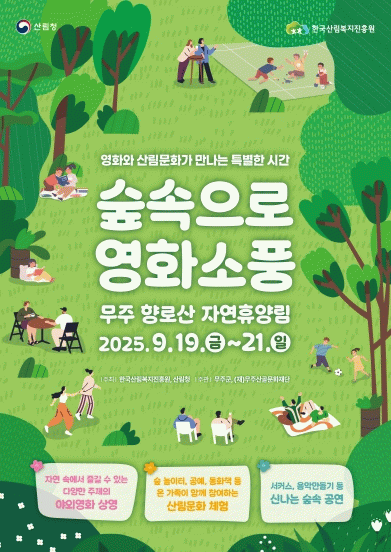 자연에서 즐길 수 있는 주제의 야외영화 2편(9. 19. (금) “어네스트와 셀레스틴: 멜로디 소동” / 20. (토) “윙키”)과 온 가족이 참여할 수 있는 산림문화 체험, 신나는 숲속 공연 등을 즐길 수 있다.