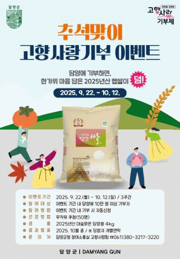 군 관계자는 “한가위를 맞이해 담양을 응원해 주시는 분들께 감사의 마음을 담아 이번 이벤트를 준비했다”며, “많은 관심과 참여를 부탁드리며, 앞으로도 건전한 기부 문화 확산에 앞장서겠다”라고 말했다.