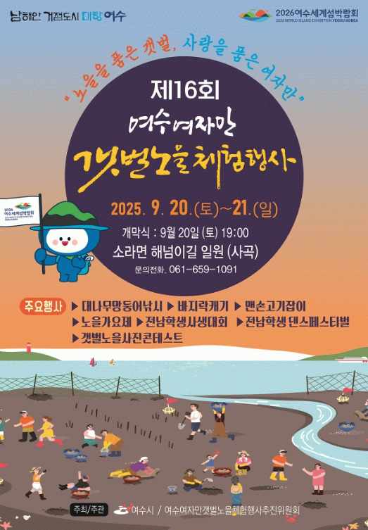정기명 시장은 “여자만의 갯벌과 노을을 배경으로 한 이번 행사는 단순한 축제를 넘어 자연과 사람, 환경이 어우러지는 의미 있는 시간으로 준비했다”며 “많은 시민과 관광객이 안전하고 즐겁게 참여해 가을의 낭만과 함께 여수의 매력을 만끽하시길 바란다”고 말했다.