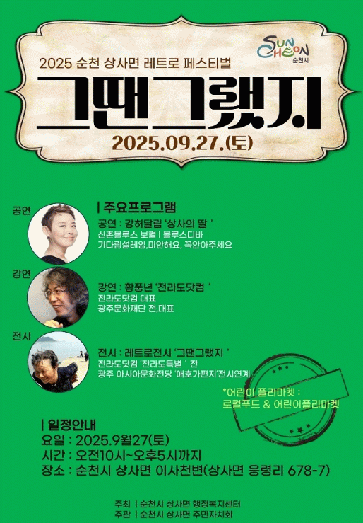 주요 프로그램으로 ▲13시 클래식 기타 연주 ▲14시 파파스중창단 공연 ▲14시 30분 황풍년 대표와 ‘전라도 사는 멋’ 토크 ▲16시 강허달림 초청 공연 등이 펼쳐지며, 이와 함께 행사장 곳곳에서는 '그땐 그랬지' 촌스런 사진전시와 플리마켓, 체험부스 등이 운영된다.