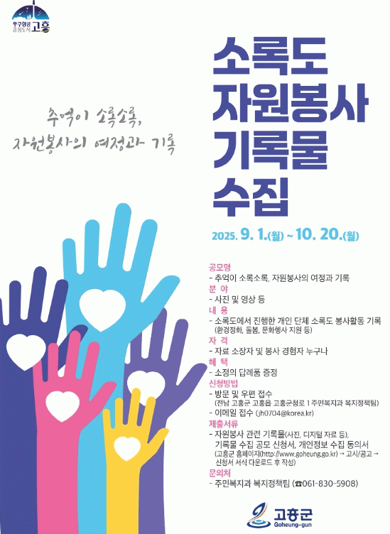 한편, 소록도 자원봉사 기록물 수집 공모 참여는 고흥군 대표 누리집에서 신청서를 내려받아 작성한 후 이메일이나 우편으로 신청서를 제출하면 된다.