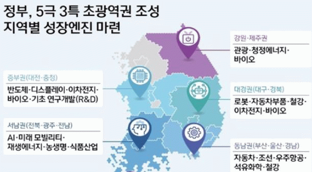 이재명 정부는 지역균형발전 정책의 큰 틀로 ‘5극 3특 체계’를 제시하며, 디지털, 에너지, 국방, 농생명, 항공우주 등 지역 특화 전략산업을 중심으로 거점별 기능 분산을 추진 중이다.