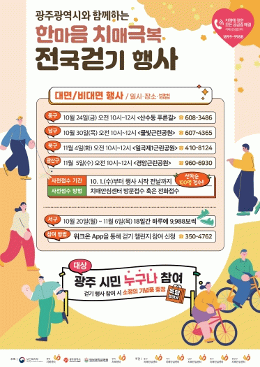 자치구별로 동구는 10월24일 푸른길분수공원에서, 남구는 10월30일 물빛근린공원, 북구는 11월4일 일곡제1근린공원, 광산구는 11월5일 경암근린공원에서 걷기행사가 진행된다. 행사 시간은 오전 10시부터이며, 치매 예방에 관심 있는 시민 누구나 무료로 참여할 수 있다.