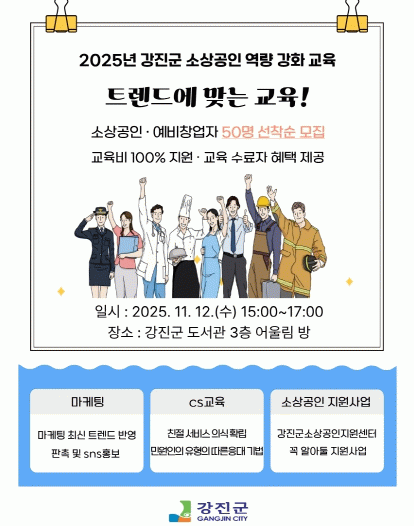 이번 교육은 개인(소상공인 및 예비창업자)과 단체(상인회 및 예비 상인회)로 나눠 접수받으며, 총 50명을 선착순 모집한다. 개인은 신청서와 개인정보 제공 동의서를, 단체는 단체용 신청서를 작성해 11월 7일까지 강진군청 지역경제연결팀에 직접 제출하거나 강진군 누리집 소상공인지원센터를 통해 온라인으로 신청하면 된다.