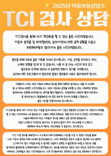 TCI 상담에 참여한 한 청년은 “검사를 통해 나를 객관적으로 바라볼 수 있었고, 기질은 타고나지만 성격은 변화할 수 있다는 점을 새롭게 깨달았다”며 “상담을 계기로 진로와 삶의 방향을 다시 생각하게 됐다”고 말했다.
