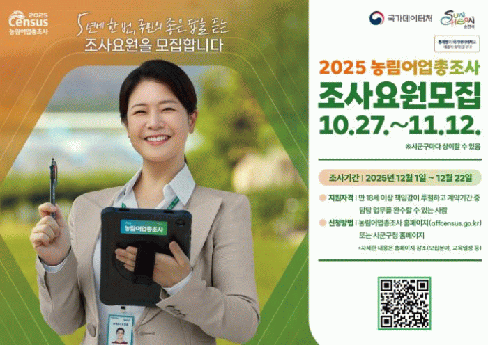 모집 공고는 2025 농림어업총조사 홈페이지와 순천시 홈페이지를 통해 확인할 수 있으며, 11월 12일까지 농림어업총조사 홈페이지 또는 순천시 디지털정책과로 방문 접수하면 된다.