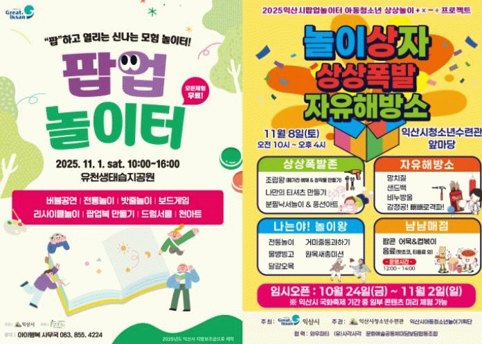 익산시는 오는 11월 1일과 8일, 아동이 직접 상상하고 기획·운영에 참여하는 '2025 익산시 팝업놀이터'를 개최한다고 30일 밝혔다.