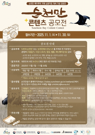 공모 주제는 ‘나만의 순천만’ 또는 ‘순천만에서 만난 나’로, 순천만의 풍경·흑두루미·갯벌·갈대밭 등 직접 촬영한 사진과 일기체 스토리, 또는 웹툰·애니메이션 등 자유 형식의 창작물을 제출할 수 있다. 전 국민 누구나 참여할 수 있으며, 순천만과 함께한 개인의 추억과 체험을 통해 생태도시 순천의 매력을 새롭게 표현할 수 있다.