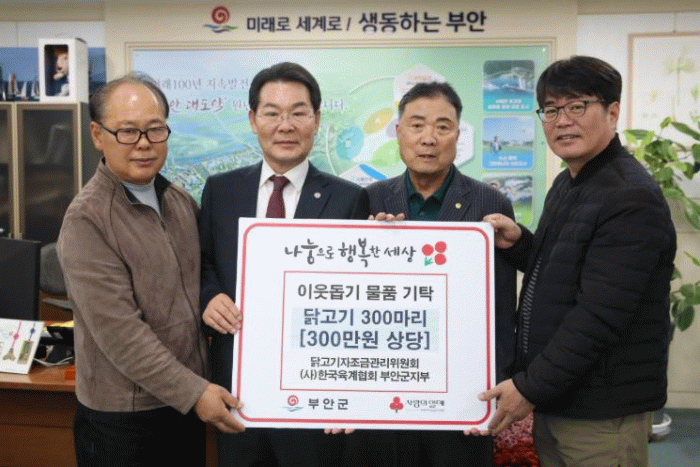 권익현 부안군수는 “어려운 이웃을 위해 따뜻한 마음을 전해주신 한국육계협회 부안군지부에 깊은 감사의 말씀을 드린다”며, “기탁된 닭고기는 소외계층이 한국육계협회의 온정을 느낄 수 있도록 잘 전달하겠다”고 말했다.