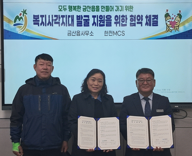 이날 협약식에 이기영 금산읍장과 한재경 한전엠씨에스(MCS) 금산지점장 등이 참석해 복지사각지대를 함께 발굴하고 지원하기 위한 협력자원연계 및 네트워크 구축 등에 나서기로 했다.