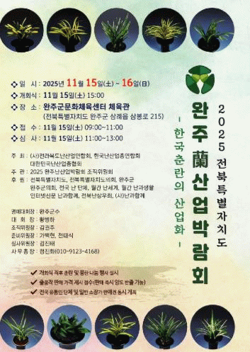 완주군은 오는 11월 15일부터 16일까지 이틀간 완주군 문화체육센터 체육관에서 ‘2025 전북특별자치도 난(蘭) 산업 박람회’를 개최한다고 밝혔다.