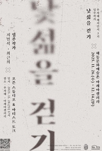 한편 입주작가(지민석, 최근희) 신작의 창작 배경과 의미를 나누는 시간이 오는 28일 금요일 오후 5시에 해동문화예술촌 아레아갤러리 및 추자혜에서 마련된다.