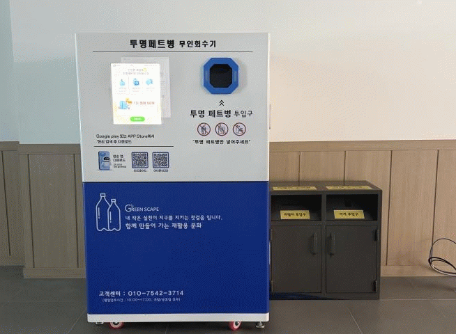 투명 페트병 무인회수기는 투명 페트병을 투입하면 포인트로 적립되는 자판기형 회수 장치다.