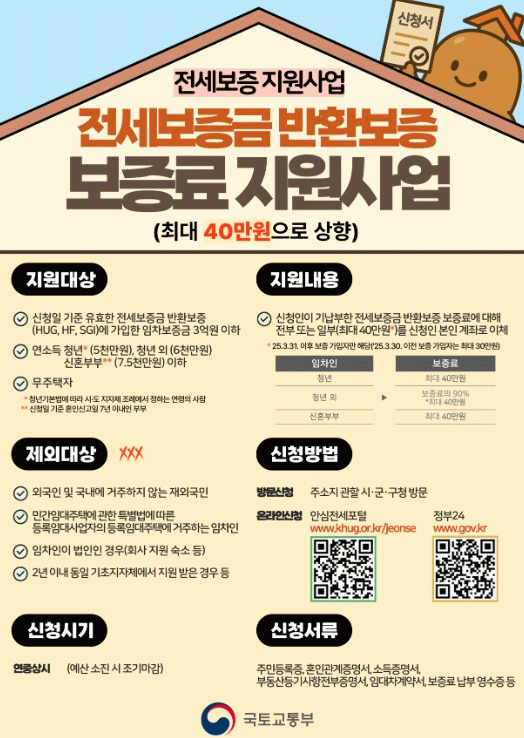 '전세보증금반환보증 보증료 지원사업'이란 최근 임대차 계약 종료 이후 보증금을 반환받지 못하는 전세사기 피해가 증가함에 따라 저소득층의 전세보증금 반환보증 가입을 유도하기 위해 추진하는 사업으로 실제 납부한 보증료를 최대 40만 원 이내로 지급한다.