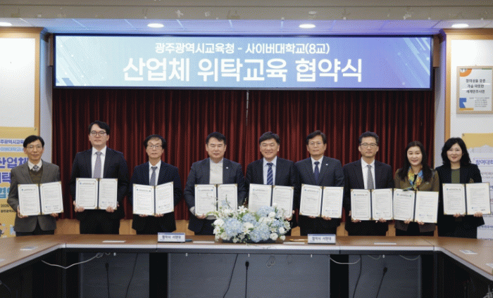 시교육청은 27일 중회의실에서 이정선 교육감, 국제사이버대학교 홍승정 총장, 서울사이버대학교 이은주 총장, 원광디지털대학교 김윤철 총장, 사이버한국외국어대학교 김병철 총장 직무대행, 한양사이버대학교 정현철 부총장, 경희사이버대학교 신봉섭 부총장, 건양사이버대학교 이진경 입학홍보처장, 고려사이버대학교 백창현 입학처장 등이 참석한 가운데 ‘산업체 위탁교육 업무협약’을 체결했다.