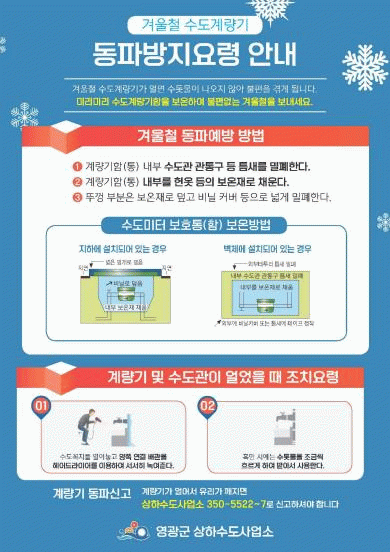 수도계량기가 동파된 경우에는 영광군 상하수도사업소에 연락하면 교체 서비스를 받을 수 있다.
