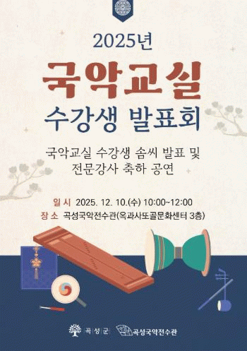 이번 행사는 1년간 진행된 국악교실 교육과정을 마무리하며 한 해의 성과를 총정리하고 결실을 공유하는 자리로, 수강생들의 발표 무대와 국악교실을 지도한 전문강사들의 축하공연으로 구성된다.