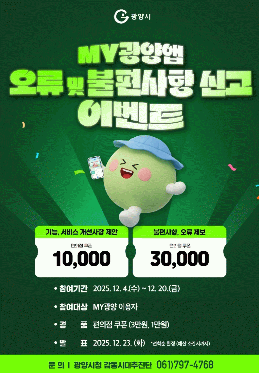 시는 지난 5월 22일 'MY광양' 앱 정식 오픈 이후 지속적으로 기능 개선을 추진해 왔으며, 오류를 제로화하고 사용자 관점에서의 불편사항을 개선해 서비스 품질을 높이고자 이번 이벤트를 마련했다.