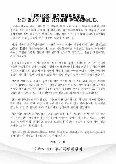 윤리특별위원회는 입장문에서 “나주시의회는 지난 12월 5일 입장문을 통해 이번 사안의 경과와 의회의 기본 입장을 시민 여러분께 발표한 바 있다”며 “윤리특별위원회는 그 입장을 엄중히 받아들이며, 이번 일로 시민 여러분께 심려를 끼쳐 드린 점에 대해 윤리특별위원회를 대표하는 위원장으로서 깊은 유감의 말씀을 드린다”고 전했다.