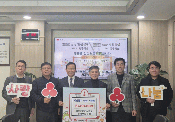 정성주 김제시장은 “나눔을 실천해 주신 대한전문건설협회에 깊이 감사드린다”며 “뜻깊은 나눔이 헛되지 않도록 필요한 분들에 잘 전달하겠다”고 밝혔다.