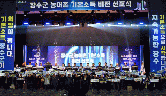 여기에 행사 참석자 전원이 ‘지속가능한 장수 기본소득으로 시작합니다’의 슬로건이 적힌 카드를 들어 올리며 환호로 화답하는 퍼포먼스가 펼쳐지며 전 군민 기본소득 시대 개막을 함께 기념했다.