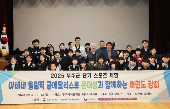 무주군이 주최하고 모두의 예체능이 주관한 이날 행사는 유소년 스포츠 활성화의 일환으로 추진됐으며, 지역 내 초·중·고등학교 태권도 수련 학생들과 일반학생 50명이 참가해 의미를 더했다.