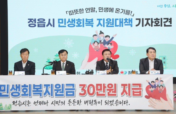 이학수 정읍시장과 박일 정읍시의회 의장은 15일 시청 대회의실에서 기자회견을 열고, 모든 시민에게 1인당 30만원의 ‘민생회복지원금’을 지급한다고 밝혔다.