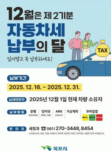 이번에 부과된 자동차세를 납부기한 내 납부하지 않으면 납부지연가산세(3%)를 추가로 부담해야 하며, 자동차 번호판 영치 및 차량 압류 등의 대상이 되니, 납부기한 내에 꼭 납부해 줄 것을 당부한다.