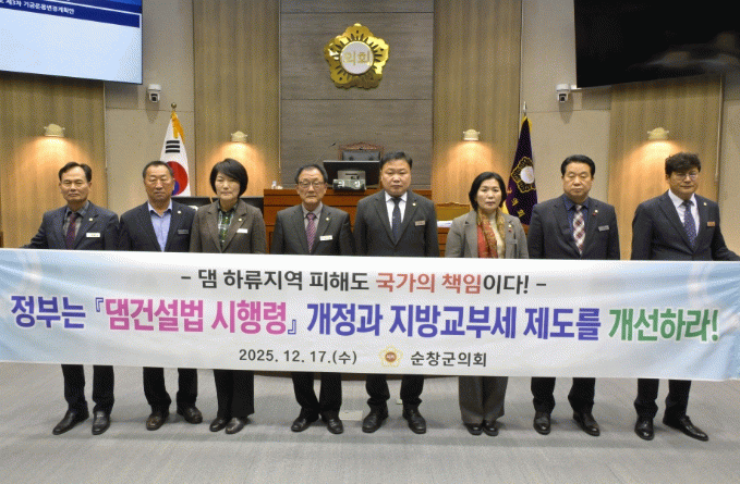 이에 순창군의회는 정부에 ▲'댐건설법 시행령'개정을 통한 댐 하류지역 지원대상 명확화 ▲사전방류 기준 강화와 방류정보 실시간 공유 등 댐 운영체계 개선 ▲지방교부세 산정 시 ‘댐 하류지역 위험부담 계수’신설을 통한 재정 지원 현실화를 강력히 촉구했다.