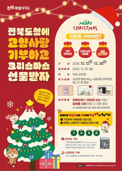 이지형 전북자치도 대외협력과장은 “고향사랑기부제는 연말정산 세액공제 혜택과 함께 지역 변화에 직접 참여할 수 있는 의미 있는 제도”라며 “도와 시·군이 준비한 다양한 연말 이벤트를 계기로 더 많은 국민이 전북 고향사랑기부에 동참해 주길 바란다”고 말했다.