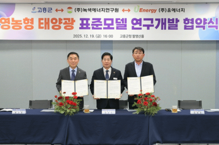 협약에 따라 ▲고흥군은 실증단지 부지 제공과 배전선로 설치 등 행정 지원을 총괄하고 ▲주관기관인 ㈜유에너지는 설비 설계 및 시공과 기술관리를 담당하며 ▲(재)녹색에너지연구원은 작물 생육환경 검토와 데이터 검증 등 기술 자문을 수행하게 된다.
