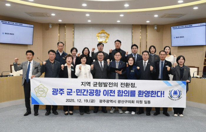 광산구의회는 19일 공병철 의원(더불어민주당, 신흥동·우산동·월곡1·2동·운남동)이 대표 발표한 성명서를 통해 “수십 년간 지역 갈등과 답보 상태로 이어져 온 군·민간공항 이전 문제에 대해 국가와 지자체가 함께 해결의 실마리를 찾았다는 점에서 매우 뜻깊은 합의”라고 평가했다.
