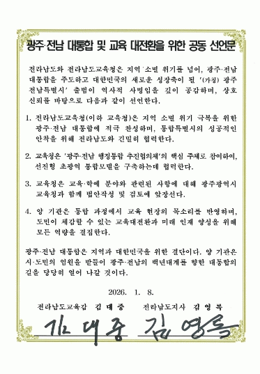 전남교육청은 4개 항으로 된 선언문에서 지역 소멸 위기 극복을 위한 광주·전남 대통합에 적극 찬성하며, 통합 특별시의 성공적인 안착을 위해 전남도와 긴밀히 협력하기로 했다.