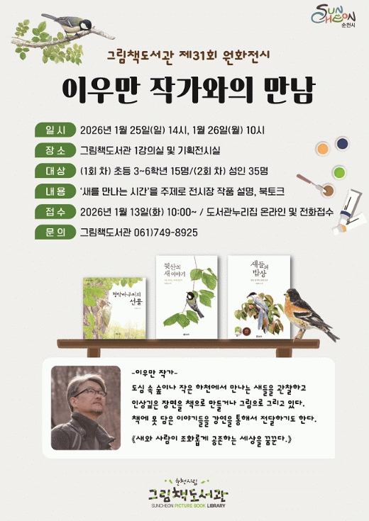 시 관계자는 “이번 작가와의 만남은 연령대와 관계없이 시민들의 생태적 감수성을 높이고, 생태수도 순천의 가치를 함께 나누는 계기가 될 것”이라며, “앞으로도 전시와 연계한 프로그램을 통해 시민들의 문화 향유 기회를 지속적으로 확대해 나가겠다”고 말했다.